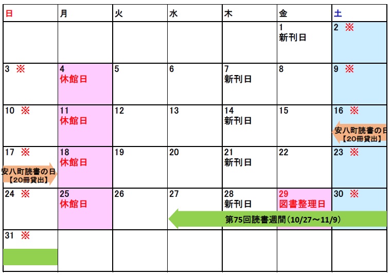- 毎月第3土日は、『安八町読書の日』として【20冊貸出】を行っています。家族で読書をお楽しみください。
